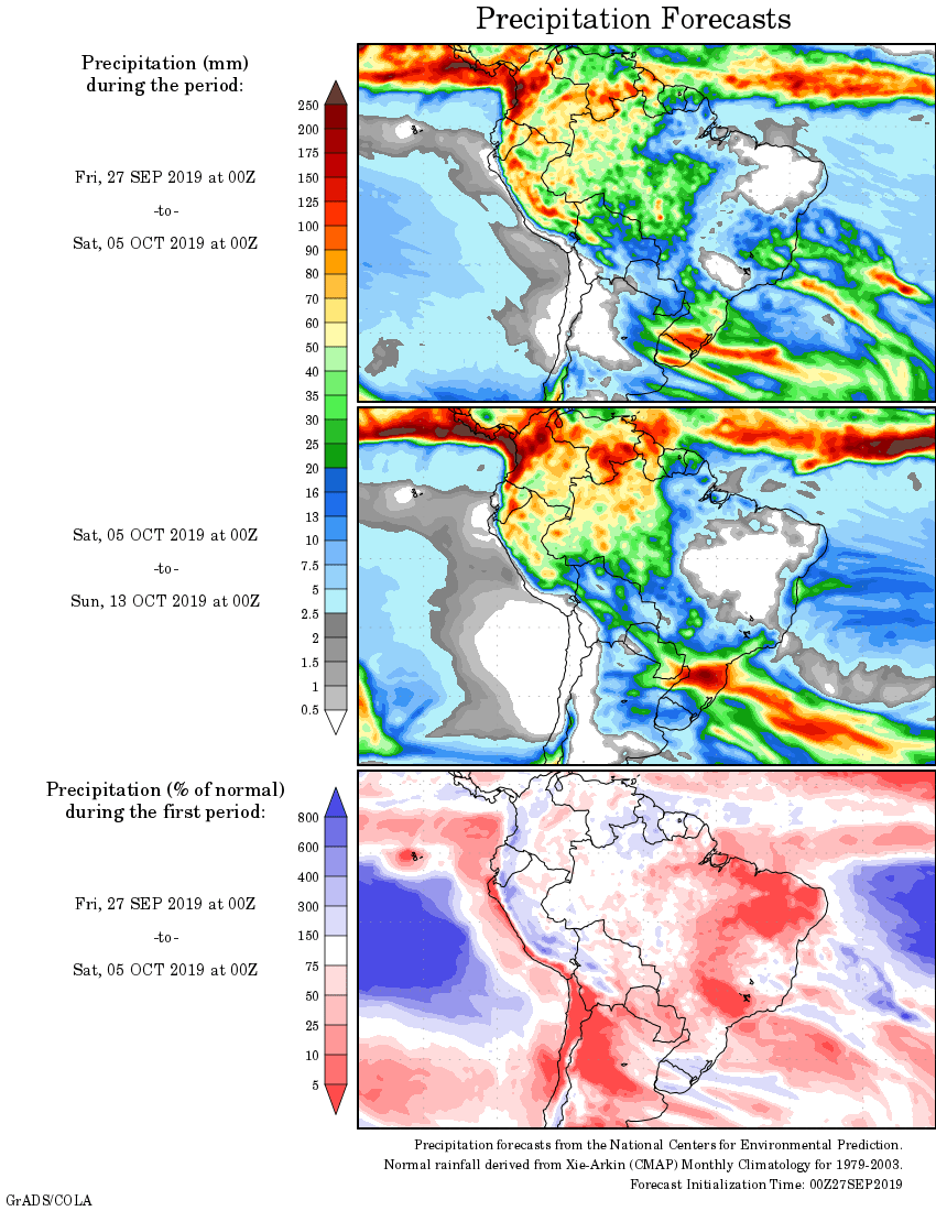 De acordo com o mapa de previsão estendida do centro de previsão da Administração Oceânica e Atmosférica Nacional (NOAA, na sigla em inglês), no período de 27 de setembro até 05 de outubro, as chuvas aparecem sobre quase todo o país, mas com maiores volumes no Sul, Norte e partes de Centro-Oeste, Sudeste e Nordeste.