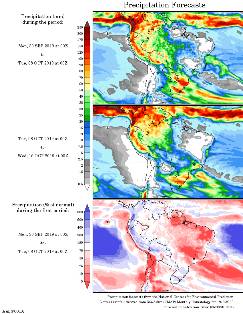 O mapa de previsão estendida do centro de previsão da Administração Oceânica e Atmosférica Nacional (NOAA, na sigla em inglês), no período de 30 de setembro até 08 de outubro, mostra chuvas sobre a maior parte do país, mas com os maiores volumes no Norte, Leste do Centro-Oeste, Sul e partes do Sudeste.