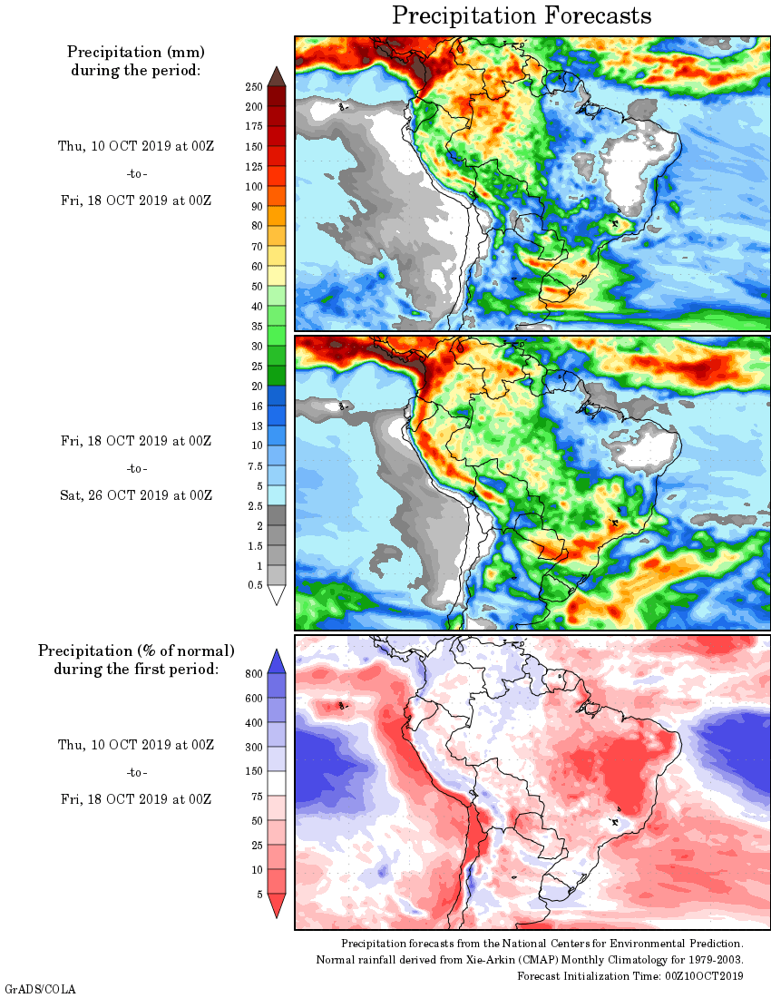 A partir do dia 18 e até 26 de outubro, mapas de tendência de precipitação apontam que acumulados altos a moderados devem ser registrados em quase todo o Brasil, segundo o centro de previsão da Administração Oceânica e Atmosférica Nacional (NOAA, na sigla em inglês).