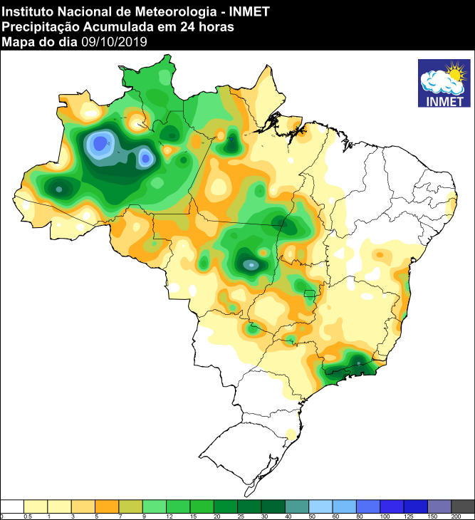 Nas últimas 24 horas, em todo o Brasil, as cinco cidades com maiores acumulados no período, segundo dados do Inmet, foram Itatiaia (RJ): 94,8 mm, Codajas (AM): 86,9 mm, Fonte Boa (AM): 84,6 mm, Santarém (PA): 82,4 mm e Canarana (MT): 72 mm.