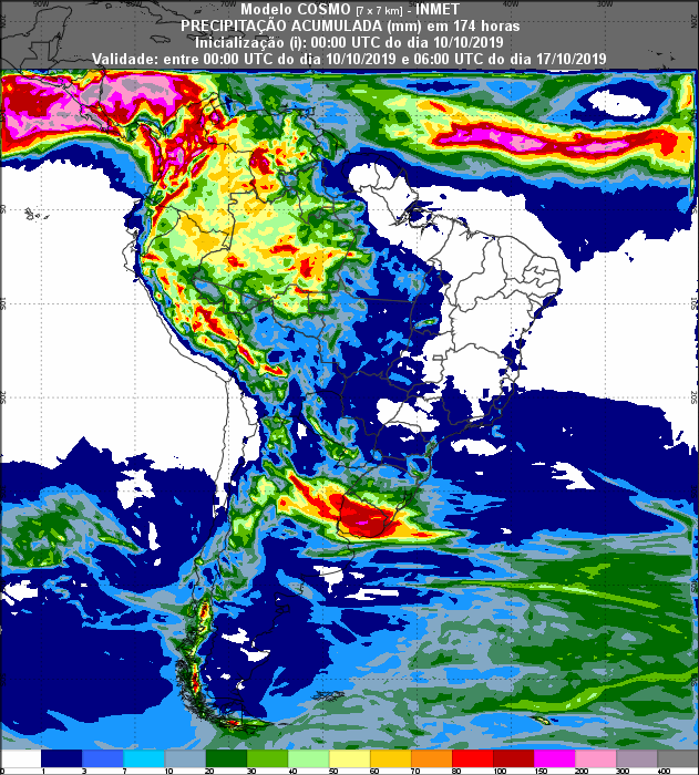 A partir do dia 18 e até 26 de outubro, mapas de tendência de precipitação apontam que acumulados altos a moderados devem ser registrados em quase todo o Brasil, segundo o centro de previsão da Administração Oceânica e Atmosférica Nacional (NOAA, na sigla em inglês).