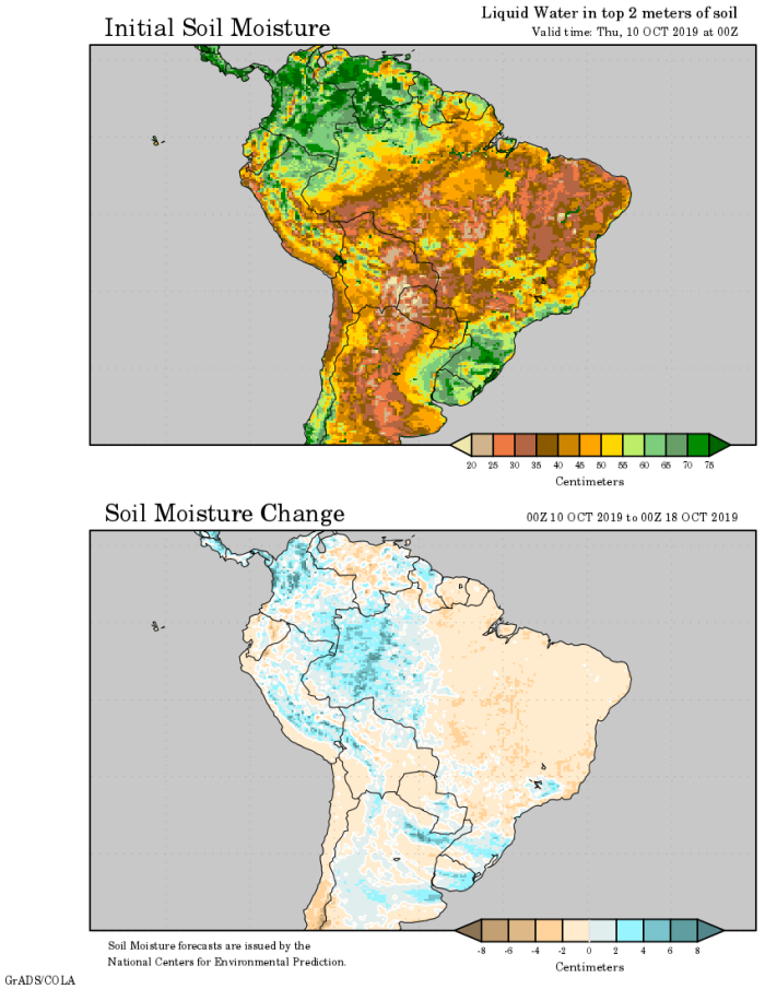 O mapa de água no solo em centímetros, do centro de previsão da Administração Oceânica e Atmosférica Nacional, aponta que melhorou a umidade melhorou nos últimos dias, principalmente em áreas do Sul e partes do Sudeste, com água no solo em até 75 centímetros.