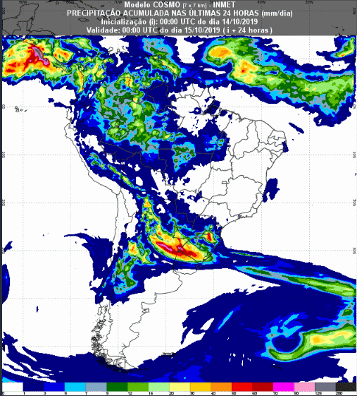 O mapa de previsão estendida do centro de previsão da Administração Oceânica e Atmosférica Nacional (NOAA, na sigla em inglês), no período de 14 até 22 de outubro, mostra chuvas moderadas a volumosas sobre vários pontos do país. Apenas Centro-Oeste e Nordeste terão poucas chuvas.