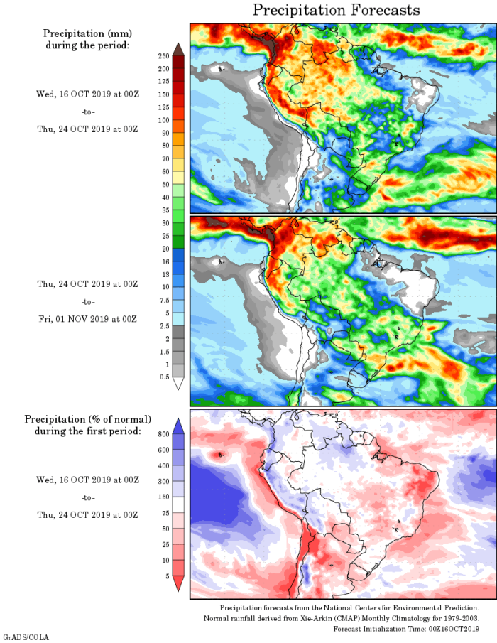 No período de 16 até 24 de outubro, o mapa mostra que chuvas leves a moderadas são previstas sobre a maior parte do país. Apenas pontos do extremo Oeste do Nordeste é que devem apresentar condição mais seca. Altos volumes são esperados no Norte, Centro-Oeste, Sudeste e Sul do Brasil.