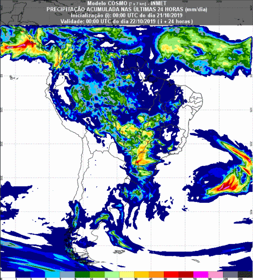 No período de 21 até 29 de outubro, o mapa de previsão estendida do centro de previsão da Administração Oceânica e Atmosférica Nacional (NOAA, na sigla em inglês), mostra que chuvas devem ser vistas sobre a maior parte do país. Apenas pontos no Nordeste terão baixos volumes.