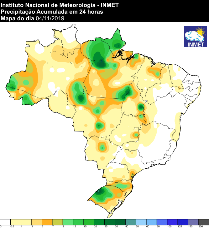 Veja o mapa de precipitação acumulada das últimas 24 horas em todo o Brasil: