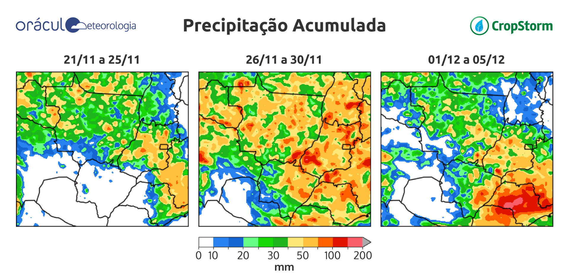 Entre 26 e 30 de novembro, a previsão indica que as chuvas devem avançar para o Mato Grosso do Sul, ficando os maiores volumes previstos para o Centro-Norte do estado. No mesmo período, as chuvas continuam expressivas no Mato Grosso e em Goiás, onde os volumes ficam entre 50 e 100 mm em todas as regiões.