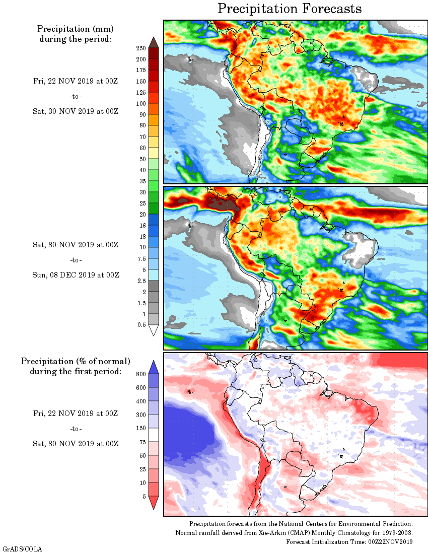 No período de 22 até 30 novembro, o mapa de previsão estendida do centro de previsão da Administração Oceânica e Atmosféria Nacional (NOAA, na sigla em inglês), mostra chuvas para as regiões Sudeste, Centro-Oeste, áreas da região sul e avanço da chuva para o Nordeste.