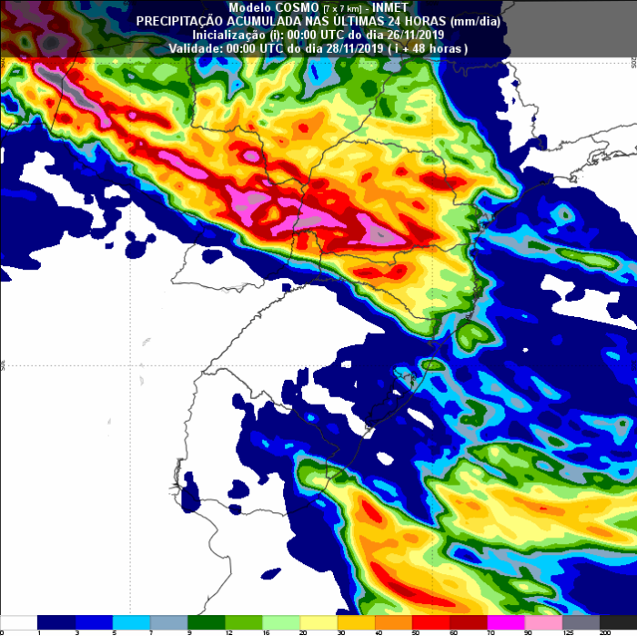 No extremo sul do Rio Grande Sul são esperados os volumes mais expressivos nas próximas 24 horas. De acordo com o modelo Cosmo, são previstas chuvas de até 70 milímetros de precipitação para a região. Nas demais áreas do estado, são esperados volumes entre 30 e 50 mm.