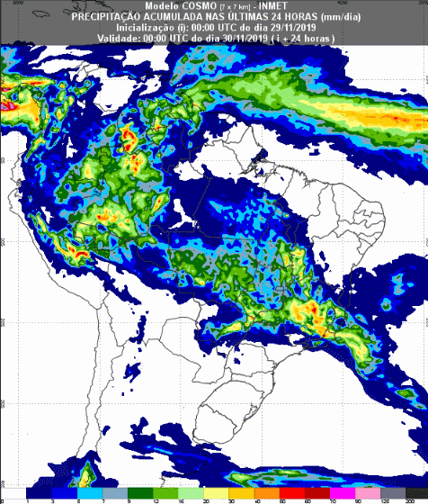 No período de 29 de novembro até 7 de dezembro, o mapa de previsão estendida do centro de previsão da Administração Oceânica e Atmosféria Nacional (NOAA, na sigla em inglês), também indica chuvas expressivas para o Centro-Oeste e Sudeste do Brasil.