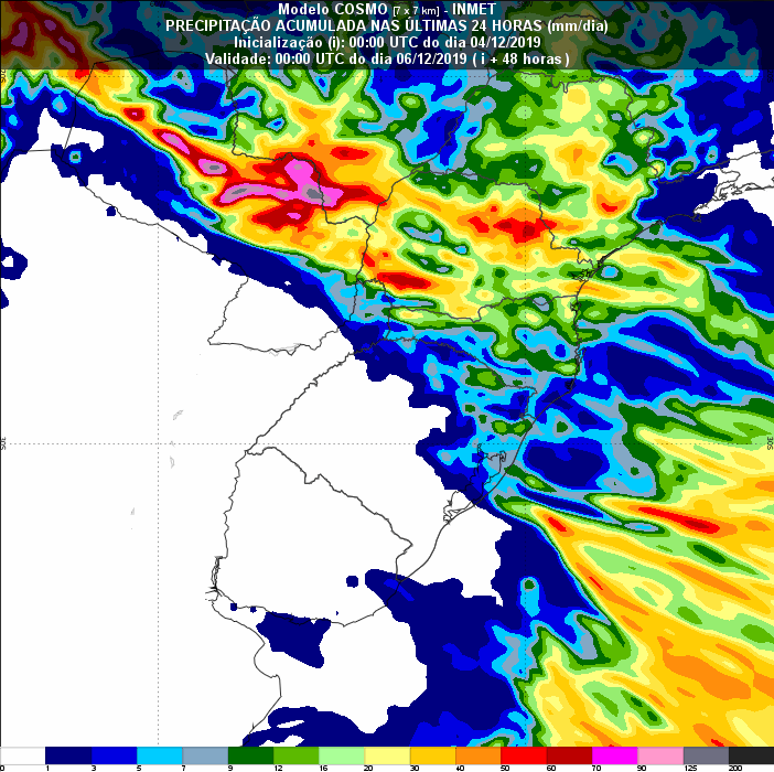 O modelo Cosmo do Inmet, indica que entre esta quarta-feira e quinta-feira (5), os volumes tendem a ficar mais significativos também no norte do Paraná, região onde os produtores mais sofreram com o atraso das chuvas para o plantio da safra 2019/20. São previstos acumulados entre 30 e 40 milímetros em todo o Paraná, com destaque para pontos da região norte onde os volumes podem alcançar 60 mm, além desta região, os mesmos volumes são esperados para oeste do estado.