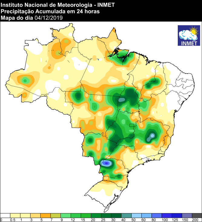 Veja o mapa de precipitação das últimas 24 horas em todo o Brasil: