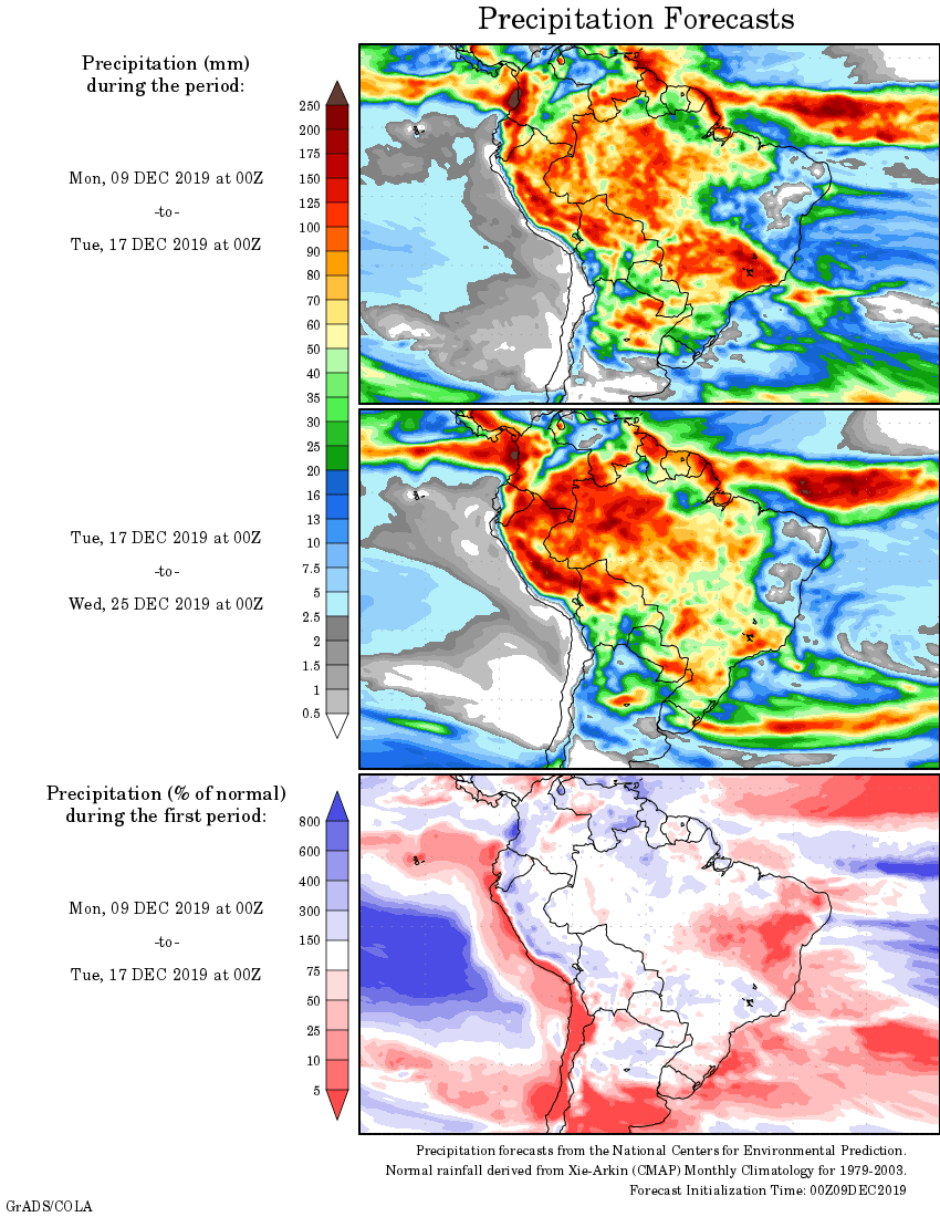 No período de 9 até 17 de dezembro, o mapa de previsão estendida do centro de previsão da Administração Oceânica e Atmosféria Nacional (NOAA, na sigla em inglês), indica chuvas volumosas para o Centro-Oeste e Sudeste do Brasil.