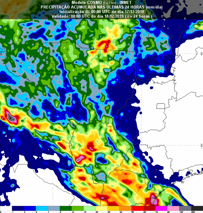 Continua chovendo de maneira expressiva no Paraná e em Santa Catarina nas próximas 24 horas. Segundo o modelo Cosmo, nos dois estados são esperados volumes entre 30 e 50 milímetros de precipitação. Já no Rio Grande do Sul apenas a região norte do estado tem condições de chuvas previstas, com até 40 mm de precipitação.