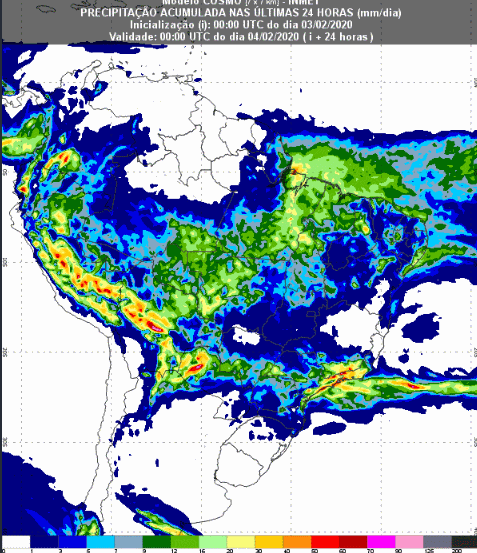 No período entre 3 e 11 de fevereiro, o mapa de previsão estendida do centro de previsão da Administração Oceânica e Atmosférica Nacional (NOAA, na sigla em inglês), prevê chuvas expressivas para o Centro-Oeste, Sudeste e áreas do Matopiba.