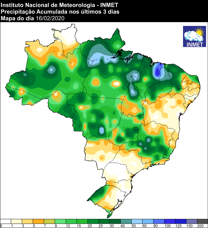 Veja o mapa de precipitação acumulada em todo o Brasil nos últimos três dias: