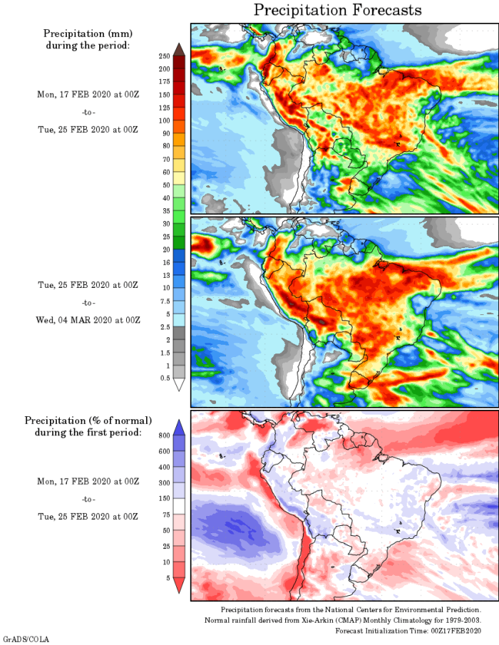 No período entre 17 e 25 fevereiro, a Administração Oceânica e Atmosféria Nacional (NOAA, na sigla em inglês) aponta chuvas entre 30 e 40 milímetros em todo o Rio Grande do Sul, os menores volumes tendem a serem registrados no leste do estado. Também de acordo com o NOAA, entre o dia 25 de fevereiro e 4 de março, os volumes passam a ficar expressivos em todo o Rio Grande do Sul, com precipitações previstas entre 80 e 100 milímetros em todo o estado.