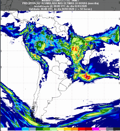 O modelo Cosmo aponta acumulados entre 20 e 40 milímetros de precipitação para o Mato Grosso nas próximas 24 horas. Ainda no Centro-Oeste também são esperadas chuvas entre 20 e 40 milímetros em todo o Goiás. Já o Mato Grosso do Sul tende a continuar sem chuvas nos próximos dias, de acordo com o Inmet. Vale lembrar que não estão descartadas pancadas de chuvas, características do Verão em toda a região.