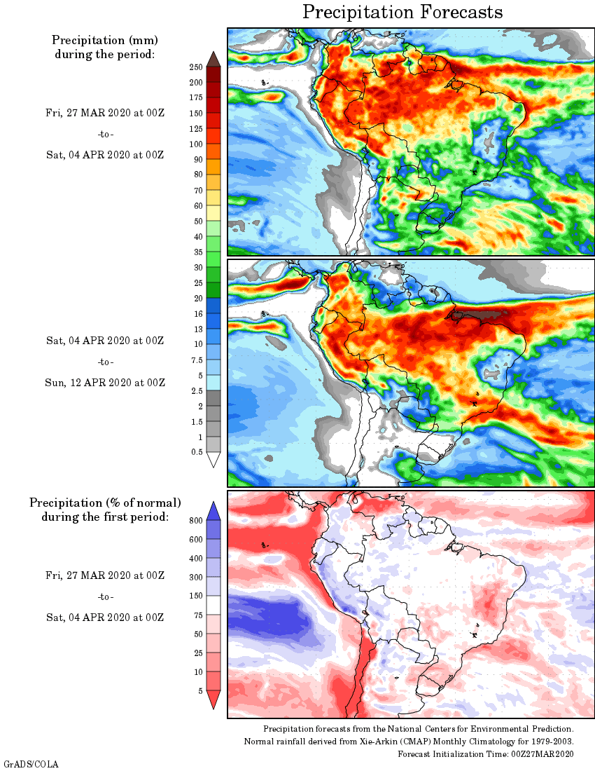 De acordo com o mapa de previsão estendida do centro de previsão da Administração Oceânica e Atmosférica Nacional (NOAA, na sigla em inglês) a tendência é de que chuvas voltem a acontecer na região sul do país no período entre 27 de março e 4 de abril.