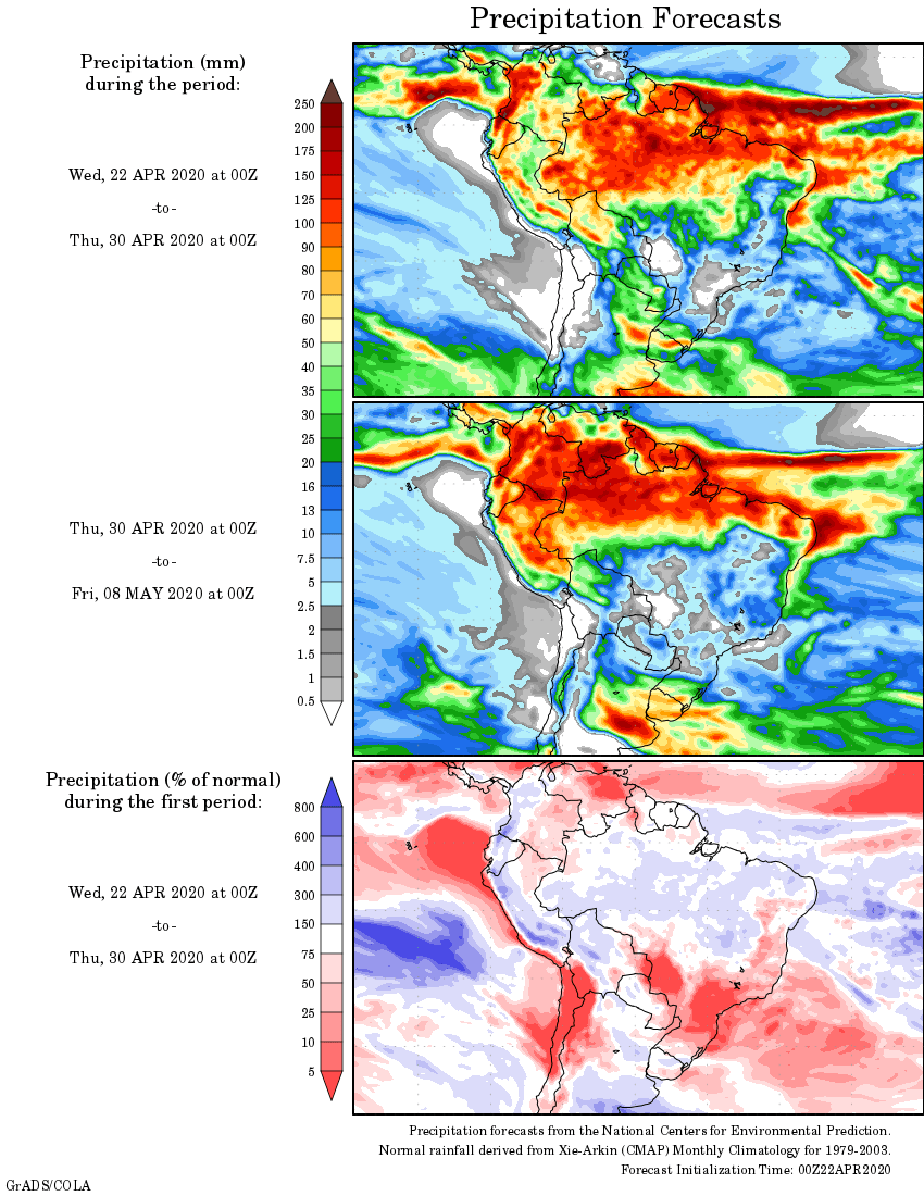 Já no período entre o dia 30 de abril e 8 de maio, Tocantins poderá ter uma queda significativa nos volumes, as previsões passam a indicar chuvas de até 20 mm. As mesmas condições são esperadas para o Mato Grosso e Goiás. Maranhão e Piauí continuam tendo previsão de volumes mais altos.