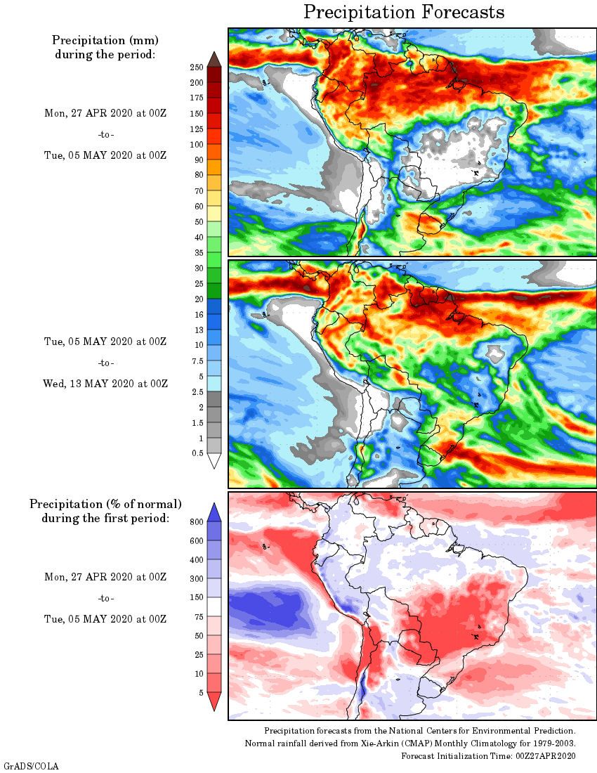 As previsões da Administração Oceânica e Atmosférica Nacional (NOAA) sinalizam que os volumes no Centro-Norte terão uma queda expressiva nos próximos dias. Na última semana, o estado do Tocantins recebeu volumes expressivos, levando transtornos aos produtores e também registrando queda na produtividade. Darcinópolis/TO espera terminar colheita da soja em até 10 dias e áreas com mais chuva devem colher 10 sacas por hectare a menos.