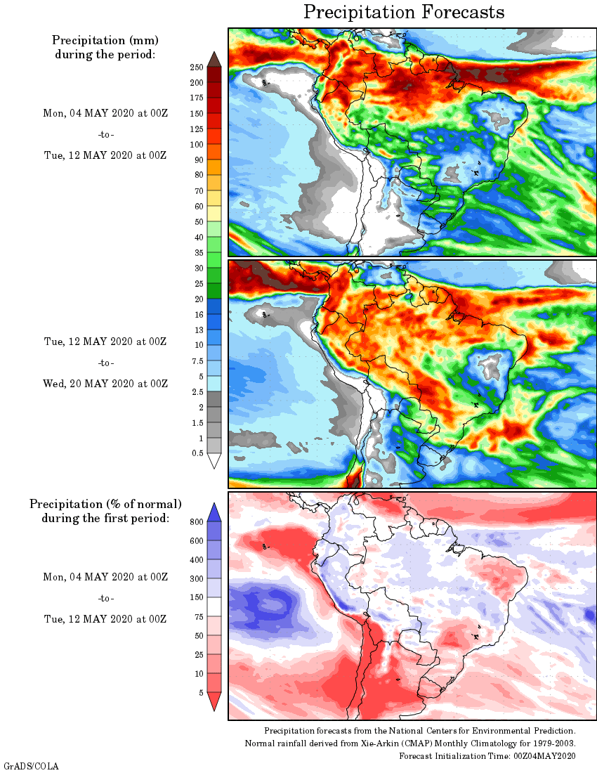 As previsões da Administração Oceânica e Atmosférica Nacional (NOAA) indicam que no período entre 4 e 12 de maio as chuvas devem se concentrar em pontos da região sul do Brasil, com precipitações de até 25 e 30 mm e no extremo norte do Brasil, com volumes acima de 150 mm. Para o Centro-Oeste, Sudeste e Matopiba deverão ter um período de tempo estável.