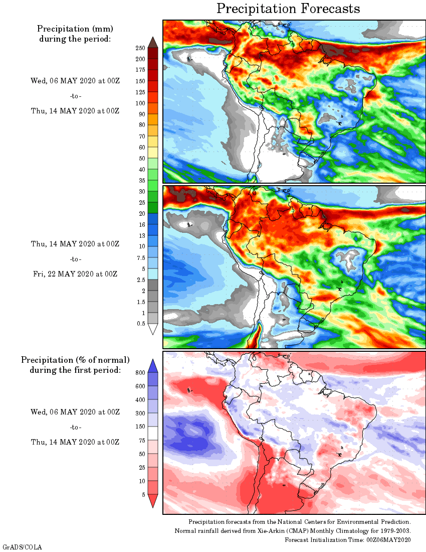 As previsões do NOAA indicam que no período entre 12 e 22 de maio, sistemas levarão novas condições de chuvas para toda a região sul do Brasil. Ainda de acordo com o modelo, neste período são esperadas precipitações acima dos 60 mm nos três estados. Apenas o sul do Rio Grande do Sul deve ter chuvas com volumes mais baixos.