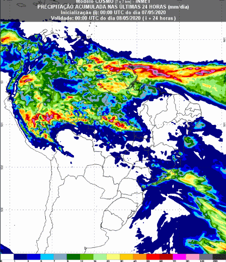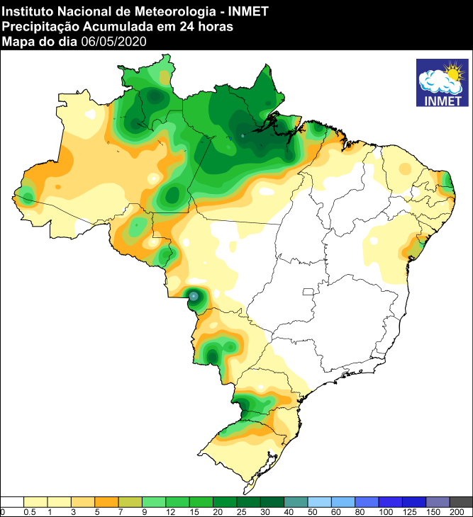 Veja o mapa de precipitação acumulada em todo o Brasil nas últimas 24 horas: