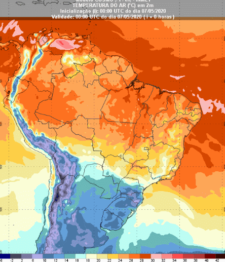 Veja o mapa de previsão de temperaturas previstas para todo o Brasil: