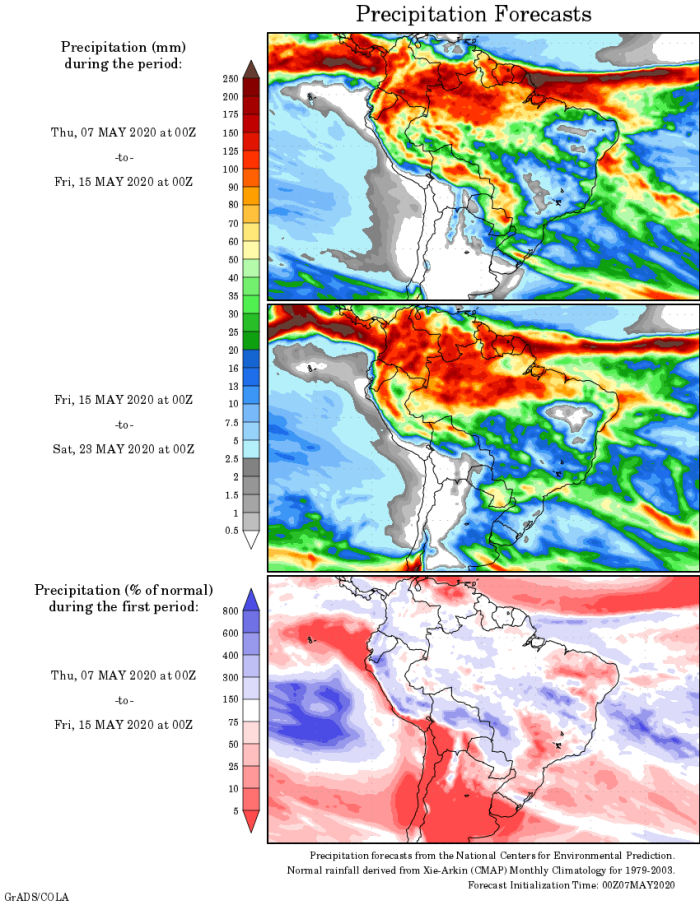 Após a passagem dessa frente fria, as previsões mais recentes da Administração Oceânica e Atmosférica (NOAA) indicam que o Rio Grande do Sul ainda poderá ter chuvas no período entre 7 e 15 de maio, com bons volumes. O NOAA também aponta volumes expressivos para o Mato Grosso do Sul neste período, com precipitação podendo chegar acima de 60 milímetros. Já Paraná e Santa Catarina devem passar por mais um período sem receber grandes chuvas.