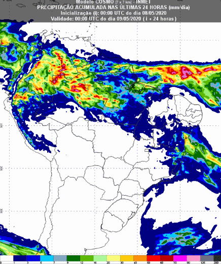 Veja o mapa de precipitação acumulada nas últimas 24 horas em todo Brasil:
