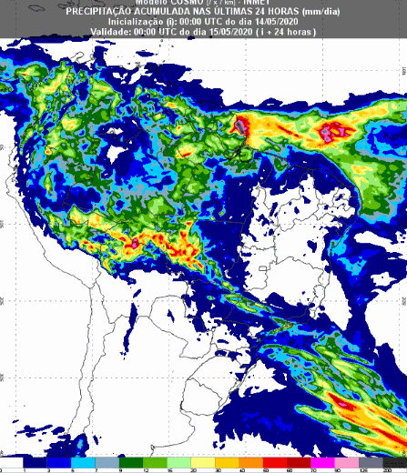 Veja o mapa de precipitação acumulada nas últimas 24 horas em todo o Brasil: