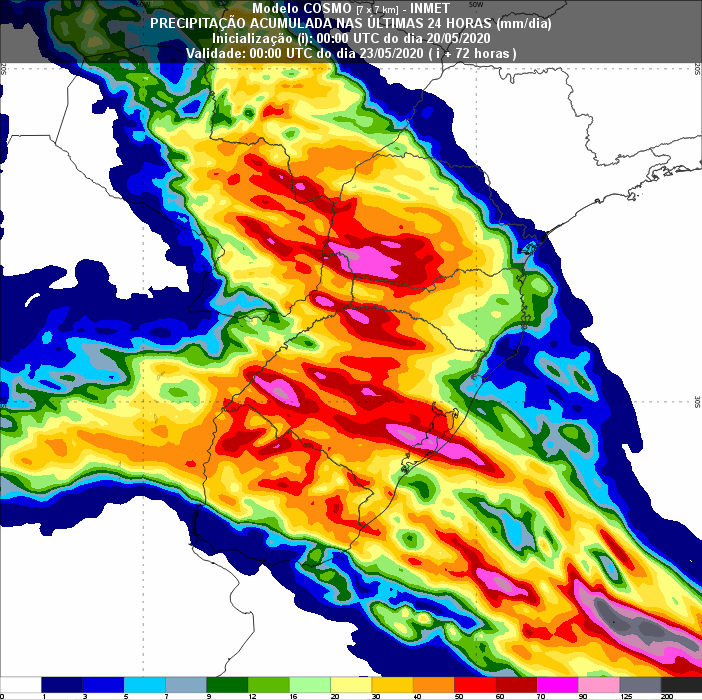 Segundo Heráclio Alves, meteorologista do Instituto Nacional de Meteorologia (Inmet), a frente começa avançar nesta quarta-feira (20), mas as chuvas mais expressivas devem acontecer a partir da quinta-feira (21). O modelo Cosmo do Inmet aponta ainda que os volumes mais expressivos devem atingir primeiramente a região oeste e extremo sul do Rio Grande do Sul, com precipitação entre 20 e 40 milímetros de precipitação.