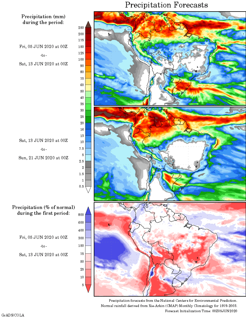 De acordo com o mapa de previsão estendida do centro de previsão da Administração Oceânica e Atmosférica Nacional (NOAA, na sigla em inglês) indicam chuvas expressivas para o Rio Grande do Sul até o próximo dia 13 de junho. Segundo os modelos americanos, os volumes devem ficar acima de 100 mm no período. Também continuam previstas chuvas para Santa Catarina e áreas do Paraná. Já para as demais regiões do país, o NOAA segue indicando o período de estiagem, sem previsão de chuvas para as demais áreas.