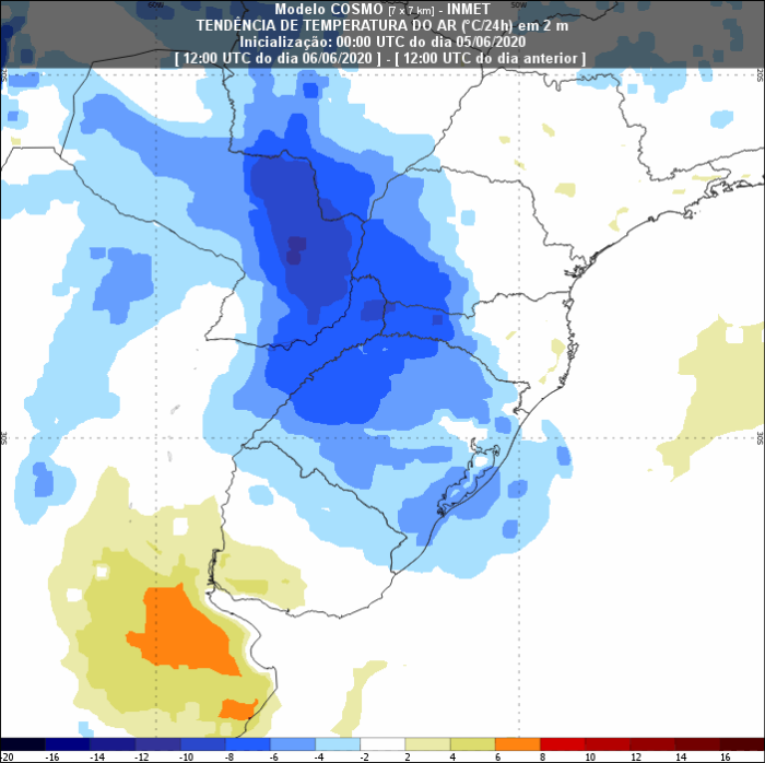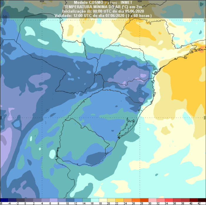 O modelo do Inmet para previsão de temperatura, indica que a miníma prevista nesta sexta-feira deve ficar entre 14 e 16 graus e no domingo as minímas devem ficar entre 4 e 6 graus no sul do Paraná e nirte de Santa Catarina. Geadas não estão descartadas e podem voltar acontecer.