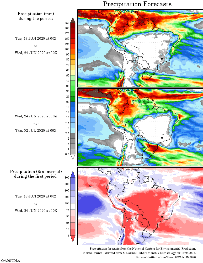 O produtor de trigo do Rio Grande do Sul enfrenta problemas para concluir o plantio do trigo no estado. Após ter que driblar a irregularidade de chuvas e altas temperaturas, as chuvas dos últimos dias paralisaram os trabalhos nas lavouras. A boa notícia, no entanto, é que o modelo de previsão estendida do NOAA, para os próximos dias, indica uma pausa nas chuvas expressivas e apenas condição de chuvas mais volumosas somente para o extremo sul do Rio Grande do Sul. Entre o período de 16 e 24 de junho, os volumes não devem ultrapassar os 40 mm nesta região.