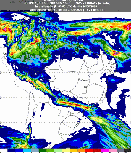 A frente fria que estava em atuação no sul do Brasil já avançou para o oceano, mas as próximas 24 horas ainda têm previsão de chuvas no extremo norte do Paraná, e sul do Mato Grosso do Sul e São Paulo. O modelo Cosmo do Inmet aponta que nos três estados, os volumes podem chegar até 60 milímetros de precipitação. A tendência é que os volumes fiquem mais intensos no sábado (27) e avançando para mais áreas dos estados, podendo ser registradas precipitação de até 70 mm.