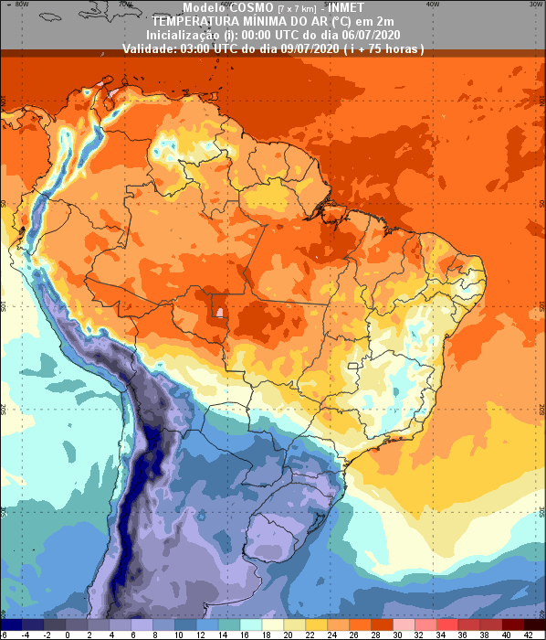 O mapa de previsão de temperatura do Inmet aponta que todo o Rio Grande do Sul deve ficar com temperatura entre 4 e 8 graus. As mesmas temperaturas devem ser registradas em Santa Catarina e extremo sul do Paraná. Francisco destaca ainda que a massa de ar frio também pode avançar para o Sudeste, mas os modelos ainda não indicam quedas expressivas no sul de Minas Gerais. A colheita do café começa a ganhar intensidade a previsão de geadas ou frio intenso, assim como a possibilidade de chuvas gera preocupações aos produtores.