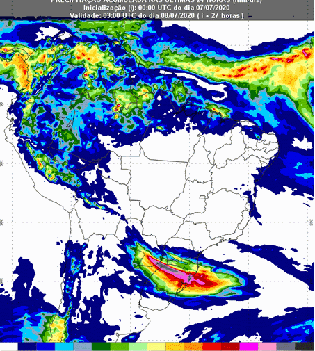 O modelo Cosmo do Inmet segue indicando que os maiores volumes devem acontecer no Centro-Norte do Rio Grande do Sul, onde são previstas chuvas de até 125 mm em algumas áreas. Também chove nas demais regiões do estado com precipitação entre 20 e 30 mm. A previsão indica ainda chuvas para Santa Catarina, com até 20 mm. Já no Paraná, são esperadas chuvas apenas para o extremo sul do estado nas próximas 24 horas, porém com volumes baixos. Olívio destaca que também podem acontecer chuvas com volumes mais baixos no extremo sul do Mato Grosso do Sul.