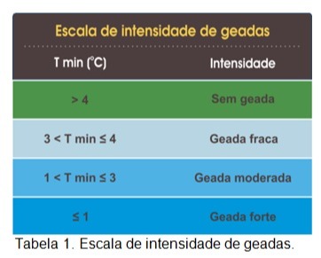 A intensidade da geada leva em consideração a temperatura prevista e tem uma escala de categorização, apresentada na Tabela 1 (abaixo).