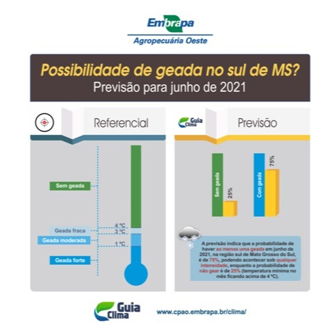 A Embrapa Agropecuária Oeste, através do seu sistema de previsão de geada, alerta para o alto risco de ocorrer geada no mês de junho de 2021, na região sul de Mato Grosso do Sul. Os dados do modelo de previsão demonstram que a probabilidade de ocorrer ao menos uma geada é de 75%, podendo acontecer sob qualquer intensidade, desde fraca até forte.