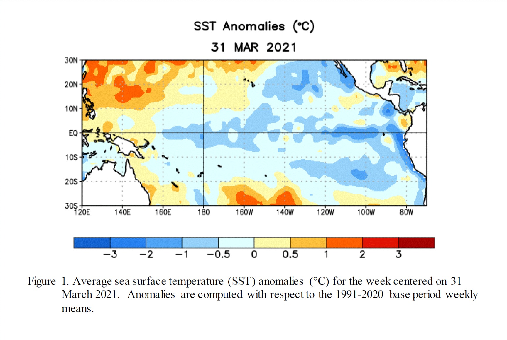 Anomalias da temperatura média da superfície do mar para a semana centrada em 31 de março de 2021. As anomalias são calculadas em relação às médias semanais do período base 1991-2020 - Fonte: CPC/NOAA