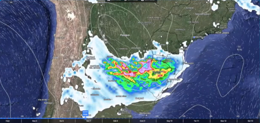 Um ciclone extratropical irá se formar na América do Sul e passará por diversas regiões agrícolas do Brasil entre quinta-feira e domingo. Segundo Maria Clara Sassaki, meteorologista da Tempo Ok, a formação do ciclone atinge primeiramente países vizinhos, como Uruguai, Paraguai e Argentina. No Brasil, a primeira região a ser atingida será a oeste do Rio Grande do Sul. "Entre quinta e sexta-feira, a área de instabilidade vai se movimentando pelo estado gaúcho. No mapa (abaixo), quanto mais vermelho, maior é o risco de chuva forte", comenta Sassaki.