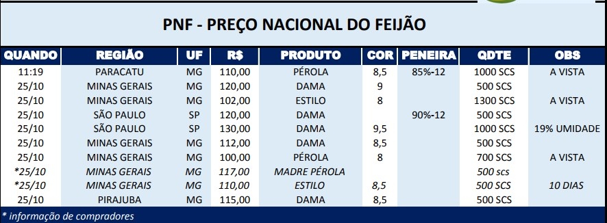 Nesta manhã, Paracatu em Minas Gerais registra vendas de feijão, tipo pérola, por R$110.