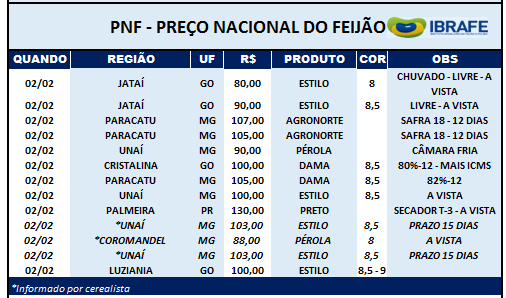 Feijão-preto – Está bastante difícil para os empacotadores manter a qualidade e agora, até mesmo com baixa qualidade, as ofertas diminuíram nos últimos dias. Por R$ 130/140, FOB Paraná, que vinha sendo para mercadoria T-2/3, agora muitas vezes pedem por um fora de tipo. Com o Feijão-carioca com preço menor, diminui o consumo do Feijão-preto.
