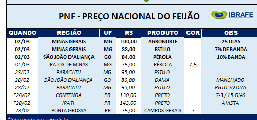 Feijão-preto - Os produtores estão firmes em suas posições, procurando negociar aos poucos. Mesmo por Feijão um pouco inferior, mantêm os níveis entre R$ 135/140. O plantio na Região Sul está encerrado. Raros são os produtores que irão se arriscar a efetuar plantios em março.
