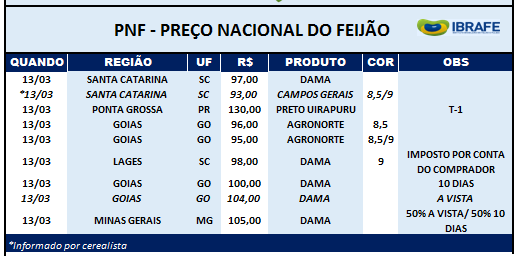 Houve negócios em todas as regiões produtoras, seja no Rio Grande do Sul e em Santa Catarina, ao redor de R$ 95, sendo que no Rio Grande do Sul inclui o ICMS, ou em Minas Gerais, que já vai firmando os R$ 105 por saca, e em Goiás, que fica entre R$ 95 e R$ 100. Ainda que esta, a princípio, seja a semana com menor volume de negócios, segue havendo um sentimento positivo por parte da maior parte dos que trabalham com Feijões de melhor qualidade. Segundo operadores do Brás havia nesta madrugada 12.000 sacos à disposição. Como sempre não houveram negócios durante a madrugada. Se for vendido será durante o dia.