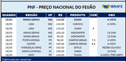 Um bom volume de Feijões nota 8,5 acima encontrou bom mercado durante a semana passada. Principalmente na quarta e na quinta-feira, houve negócio por até R$ 110 em Minas Gerais. Isto levou os produtores a venderem parte de seus estoques com a intenção de fazer um preço médio, ainda que possa haver novas valorizações. Há estoques de Feijões comerciais em outras regiões como Mato Grosso e Paraná. Há também alguns lotes recém-colhidos no Paraná, em Santa Catarina e no Rio Grande do Sul.