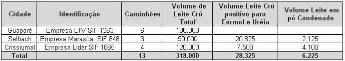 Do volume apreendido pertencente às empresas Líder e Marasca, serão destruídas 4,1 toneladas e 2,12 toneladas de leite em pó, respectivamente. Em relação à primeira empresa, o produto adulterado (7,5 mil litros) foi misturado com o leite do silo do posto em Crissiumal, totalizando 33 mil litros que foram transformados em leite em pó.