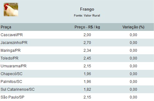Confira os preços do frango vivo nas principais praças: